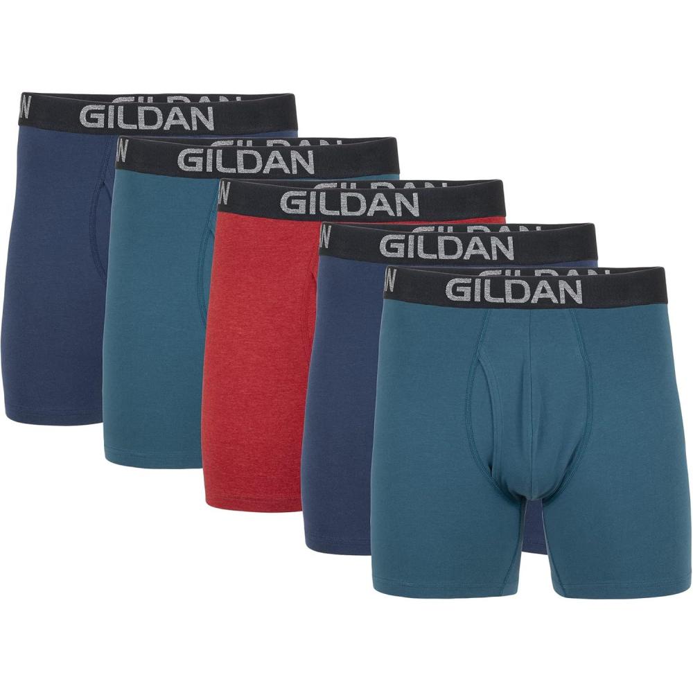 Gildan Men’s Underwear Cotton Stretch Boxer Briefs, Multipack(Blue Cove/Hawaiian Blue/Heather Red Mark (5-pack Regular Leg))