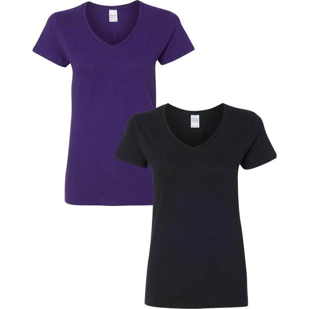 Gildan Women’s Heavy Cotton V-Neck T-Shirt, 2-Pack((1) Purple + (1) Black)